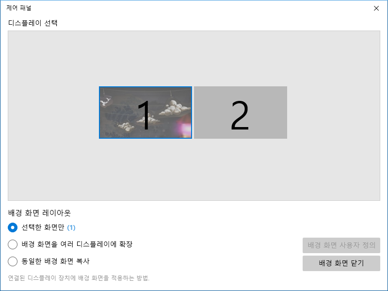 원하는 모니터 번호를 선택한 후 원하는 배경화면을 선택하면 해당 모니터의 바탕화면이 변경됩니다.